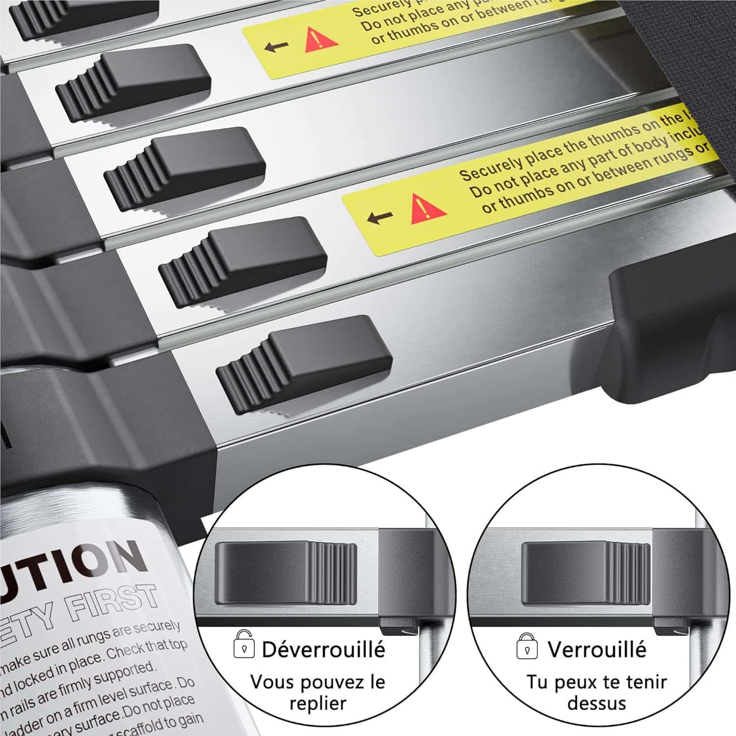 Opération facile: pour l’extension il suffit de soulever une section, d’écouter le son de << clic >>, confirmez que les deux blocages gauche/droite sont en place ; pour la rétraction, c’est un processus à une seule main, déverrouillez une étape et une étape, il se rétracte, ne placez pas la main dans l’espace des marches lorsque vous la rétractez et vous pouvez couper votre main.